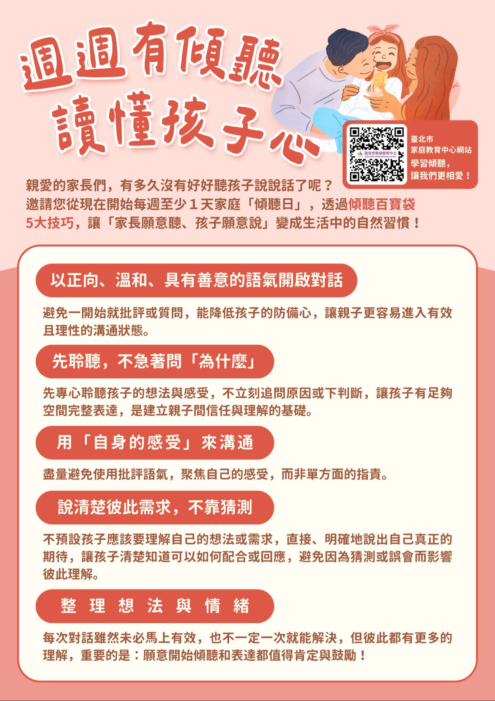 一、為推動家庭「傾聽日」及打造「家長願意聽,孩子願意說」的環境,鼓勵所有家長每週至少撥出一天為家庭「傾聽日」,暫時放下手邊的