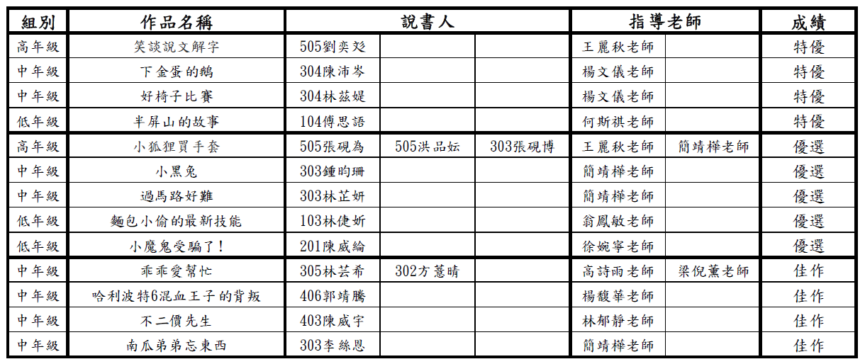 特優作品將代表本校參加112年度臺北市小小說書人比賽。