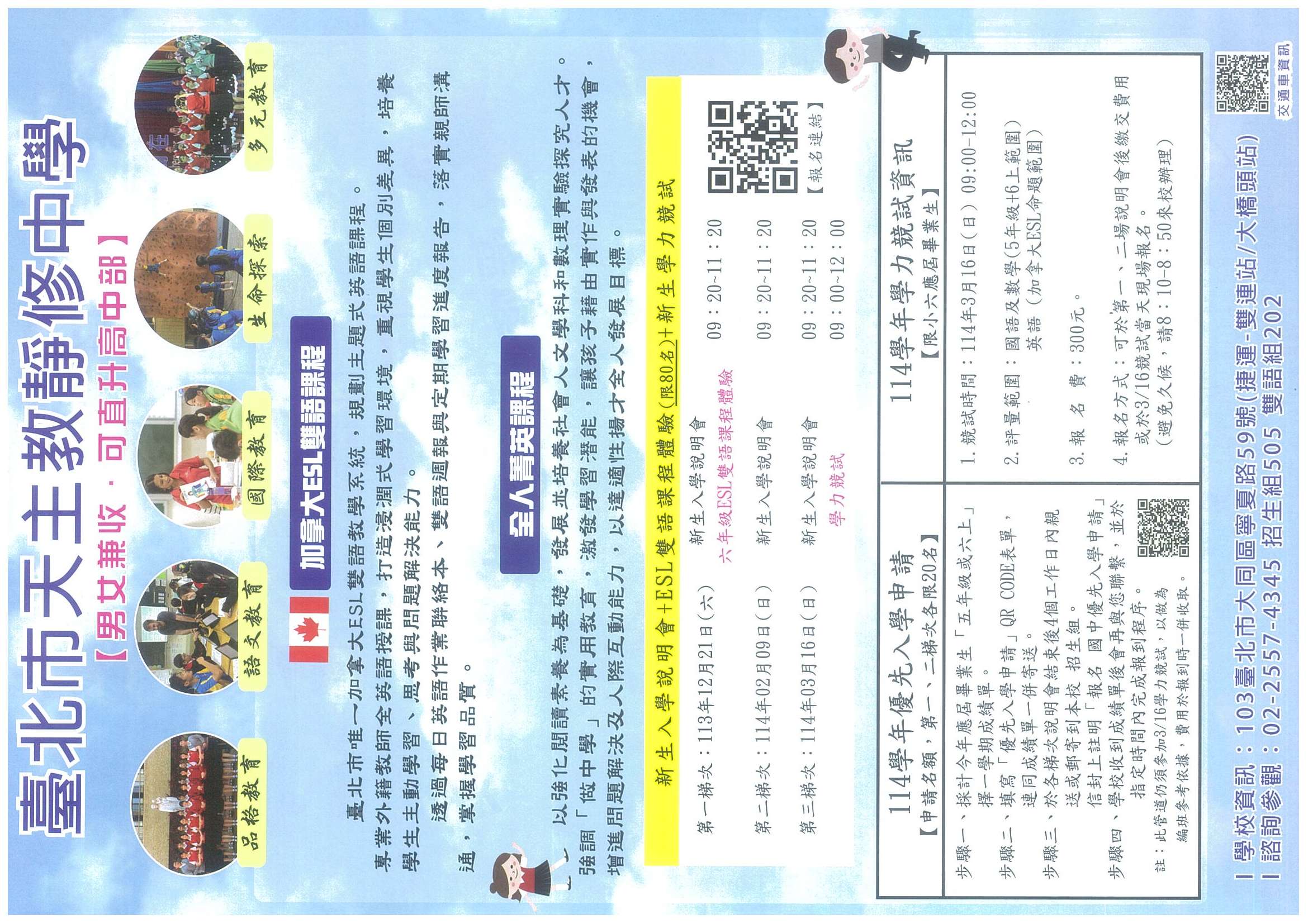 二、國中部招生說明會地點:臺北市大同區寧夏路72號。 三、報名方式:請至靜修中學網頁報名(www.bish.tp.edu. tw)。