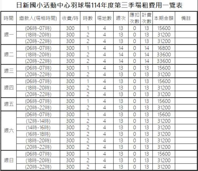 保證金每隊為新臺幣5,000元整(1,250元*4面場地),各場次預估費用如附件。