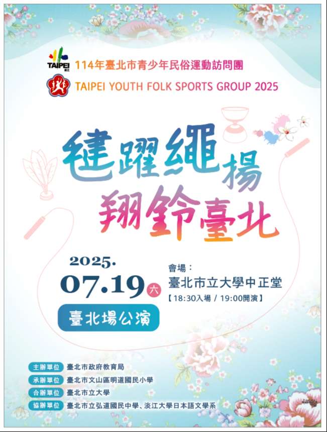 一、為發揚我國傳統民俗活動,本局每年定期選拔本市中小學 跳繩、踢毽及扯鈴等3項運動表現優異學生組成訪問團出國 訪演,足跡遍及世界各大洲,所到之處備受海外僑胞及友 邦人士喜愛,本(114)年亦規劃前往日本進行訪演。